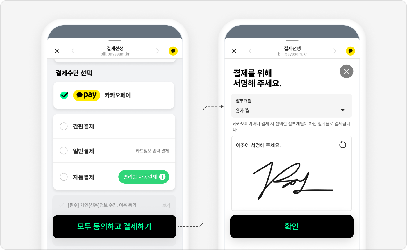 [모두 동의하고 결제하기] - 할부 개월수 선택 / 서명 입력(5만원 이상 해당)
