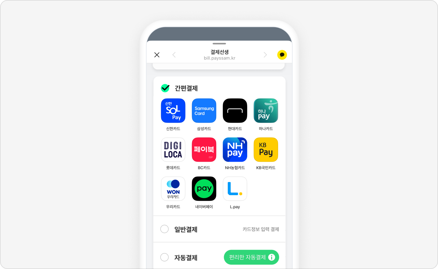 다양한 결제수단을 골라서 간편하게 결제하세요.