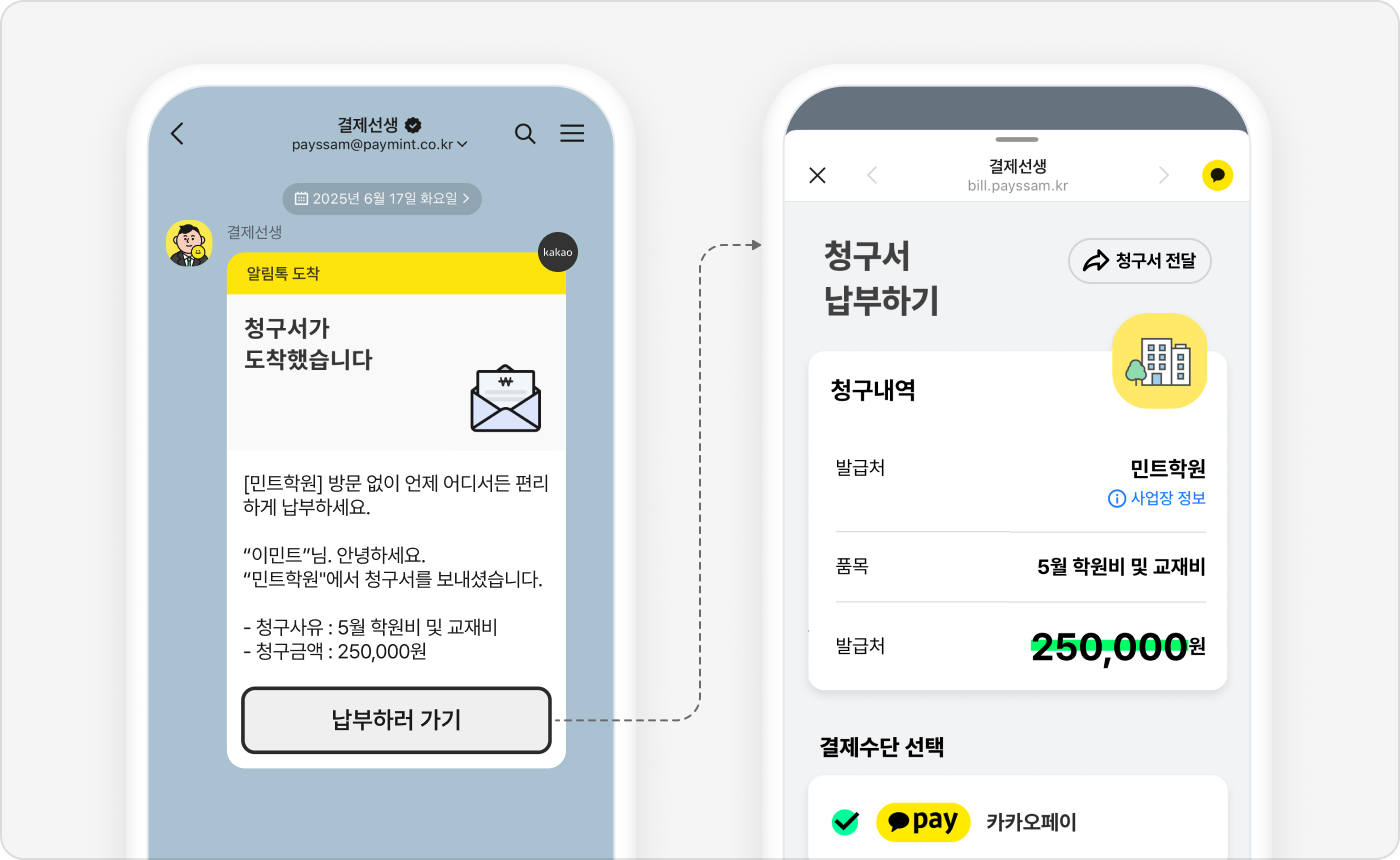 앱 설치 또는 회원가입 없이 카카오 알림톡 청구서 링크에 접속해서 결제할 수 있어요.