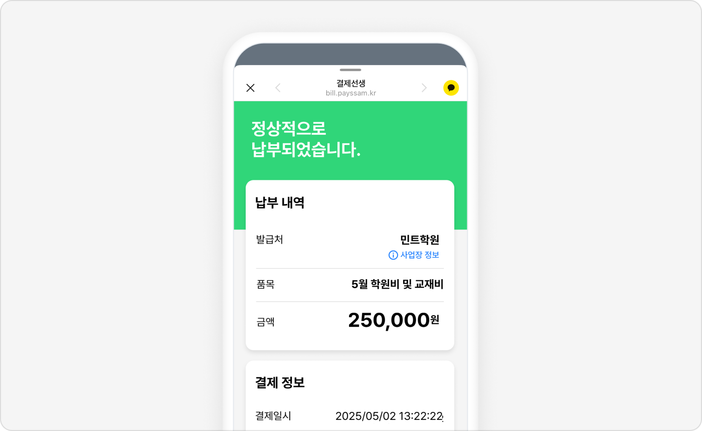결제선생은 고객이 매장에 방문하지 않고 언제 어디서나 비대면 결제할 수 있는 청구서랍니다.